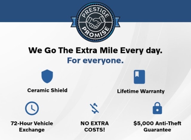 INTRODUCING THE PRESTIGE PROMISE We Go The Extra Mile EVERY DAY. FOR EVERYONE. Benefits include: ⢠Lifetime Warranty ⢠Ceramic Shield Protection ⢠72-Hour Vehicle Exchange ⢠Complimentary Delivery & Much More...